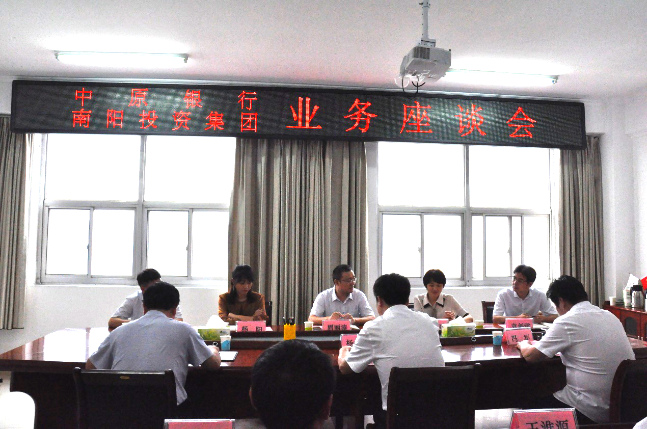 2020年7月31日,南陽投資集團與中原銀行召開業(yè)務(wù)座談會。集團黨委書記、董事長楊振中,黨委委員、總經(jīng)理高增偉及集團相關(guān)班子成員,中原銀行總行副行長周麗濤、總行授信審批部總經(jīng)理邱景及相關(guān)領(lǐng)導(dǎo)參加會議。