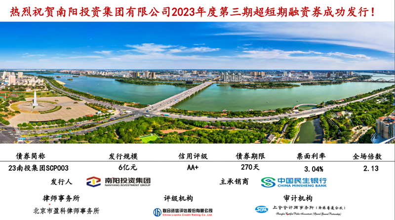 第三期超短期融資券(23南投集團SCP003)的成功發(fā)行,彰顯了南陽省域副中心城市的地位,更彰顯了南陽市委市政府的卓越領(lǐng)導(dǎo),更是全市上下奮力拼搏譜新篇的最真實寫照。南陽投資集團作為南陽地區(qū)最大最強的國企,在本次發(fā)行工作中展現(xiàn)出強大的企業(yè)綜合實力和市場影響力,進一步加強了全國范圍內(nèi)市場化投資人對南陽區(qū)域和南陽投資集團的了解,集團憑借本次在資本市場上持續(xù)的強力表現(xiàn),繼續(xù)穩(wěn)居“強AA+”行列,為今后拿下AAA評級進一步打下堅實基礎(chǔ)。