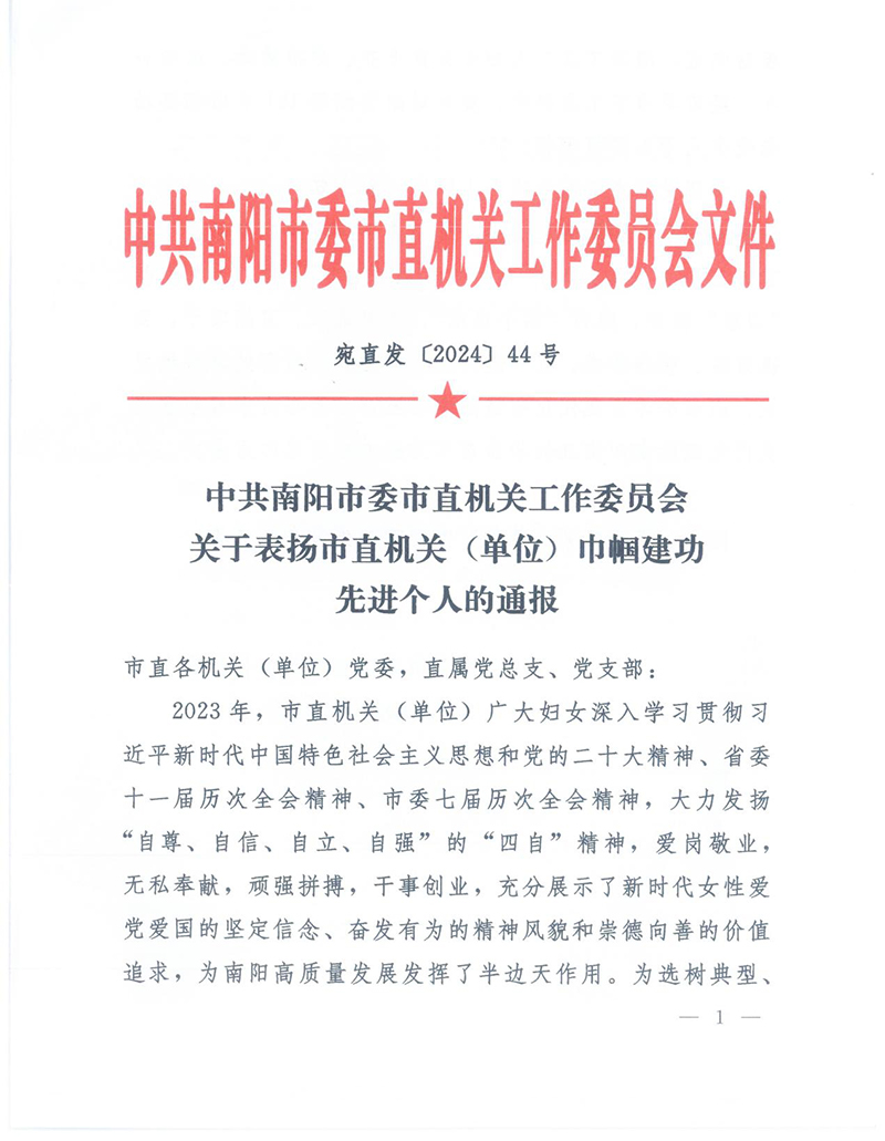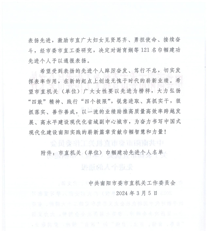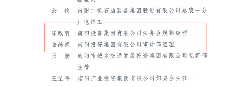 縱觀歷史長河,婦女是物質(zhì)文明和精神文明的創(chuàng)造者,是推動社會發(fā)展和進(jìn)步的重要力量;放眼神州大地,億萬女性用自身的發(fā)展,標(biāo)注著社會文明所抵達(dá)的高度;在廣闊的社會舞臺上,廣大女同胞在創(chuàng)新中自強(qiáng)不息、在創(chuàng)造中開拓進(jìn)取、在創(chuàng)業(yè)中艱苦奮斗,彰顯了勤勞勇敢、堅(jiān)韌剛毅、智慧豁達(dá)的新時代女性風(fēng)采。近日,中共南陽市委市直機(jī)關(guān)工作委員會下發(fā)文件《關(guān)于表揚(yáng)市直機(jī)關(guān)(單位)巾幗建功先進(jìn)個人的通報》,其中南陽投資集團(tuán)法務(wù)合規(guī)部經(jīng)理陳麒羽、審計(jì)部經(jīng)理陸繼娟榮獲市直機(jī)關(guān)(單位)巾幗建功先進(jìn)個人稱號,她們立足崗位,積極擔(dān)當(dāng)作為,錘煉過硬本領(lǐng),展現(xiàn)了女性的時代擔(dān)當(dāng)、巾幗風(fēng)采!