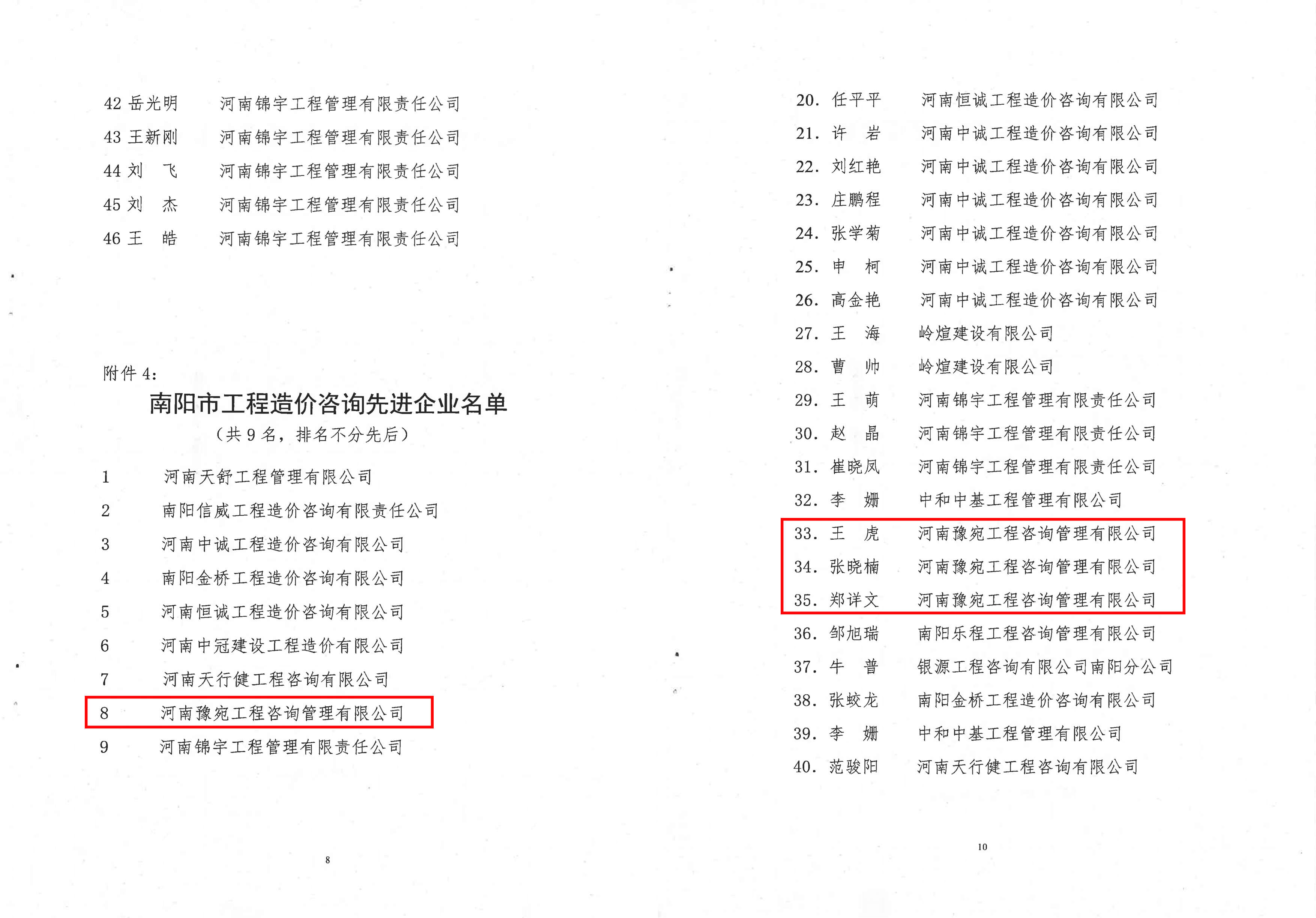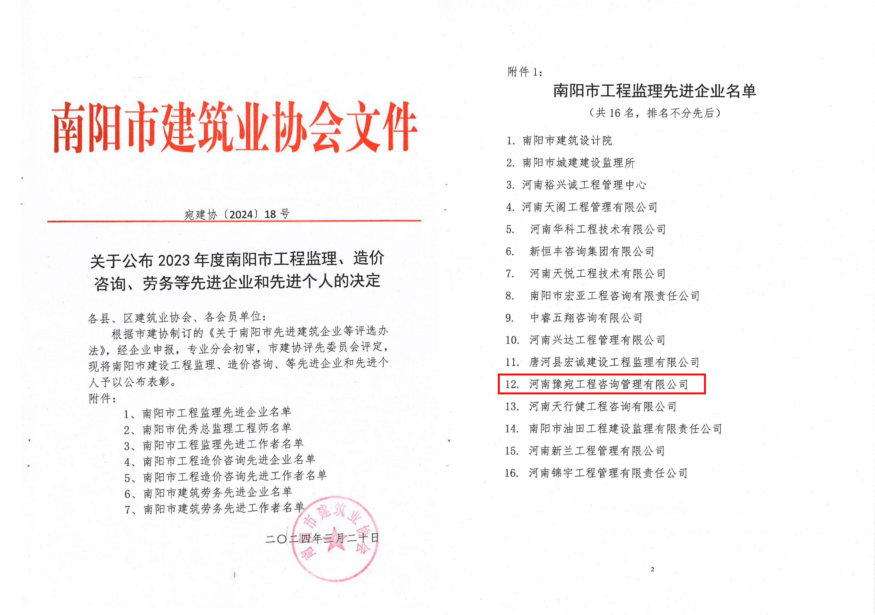3月25日,南陽市建筑業(yè)協會召開第六屆第二次會員大會,會議公布并表彰了2023年度南陽市工程監(jiān)理、造價咨詢、勞務等先進企業(yè)和先進個人,集團下屬河南豫宛工程咨詢管理有限公司(簡稱:豫宛咨詢公司)榮獲南陽市建筑業(yè)協會頒發(fā)的“2023年度南陽市工程造價咨詢先進企業(yè)”和“2023年度南陽市工程監(jiān)理先進企業(yè)”兩項殊榮,公司員工王虎、張曉楠、鄭詳文3人獲得“2023年度南陽市工程造價咨詢先進工作者”榮譽稱號。
