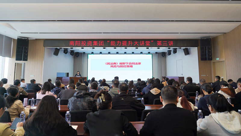 為進一步完善風(fēng)險防范體系建設(shè),落實“依法治企、合規(guī)經(jīng)營”的理念,提高干部職工法律風(fēng)險防范及合規(guī)意識水平,10月31日,南陽投資集團舉辦“能力提升大講堂”第三講合同法律風(fēng)險與防控策略專題培訓(xùn)。集團人力資源總監(jiān)趙書沛,建投公司總經(jīng)理呂秉鈐,部分中層干部及相關(guān)員工90余人參加培訓(xùn),集團法務(wù)部經(jīng)理陳麒羽授課。
