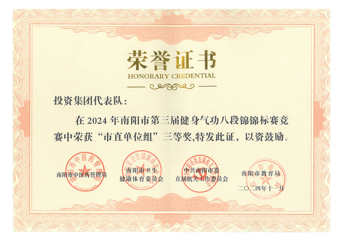 由南陽市中醫(yī)藥管理局、南陽市衛(wèi)生健康體育委員會、中共南陽市委直屬機(jī)關(guān)工作委員會、南陽市教育局聯(lián)合主辦的“南陽市第三屆健身氣功八段錦錦標(biāo)賽”于2024年10月29日至30日成功舉辦。南陽投資集團(tuán)代表隊(duì)同來自市直各單位的20支代表隊(duì)齊聚一堂,同臺競技,首次參賽榮獲“市直單位組”三等獎。