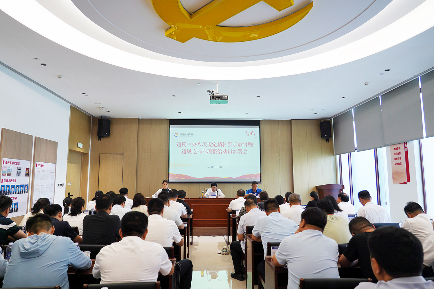 5月20日,南陽投資集團(tuán)召開違反中央八項(xiàng)規(guī)定精神警示教育暨違規(guī)吃喝專項(xiàng)整治工作部署會(huì),深刻剖析典型案例,教育引導(dǎo)黨員干部堅(jiān)決抵制違規(guī)吃喝等歪風(fēng)邪氣,進(jìn)一步嚴(yán)明紀(jì)律規(guī)矩,營造風(fēng)清氣正的政治生態(tài)。集團(tuán)黨委副書記韓玉奇主持會(huì)議并作部署講話,市紀(jì)委監(jiān)委駐市管國有企業(yè)第一紀(jì)檢監(jiān)察組副組長于智博到會(huì)指導(dǎo),集團(tuán)各黨支部書記、各部室及域內(nèi)子公司主要負(fù)責(zé)人參加會(huì)議。