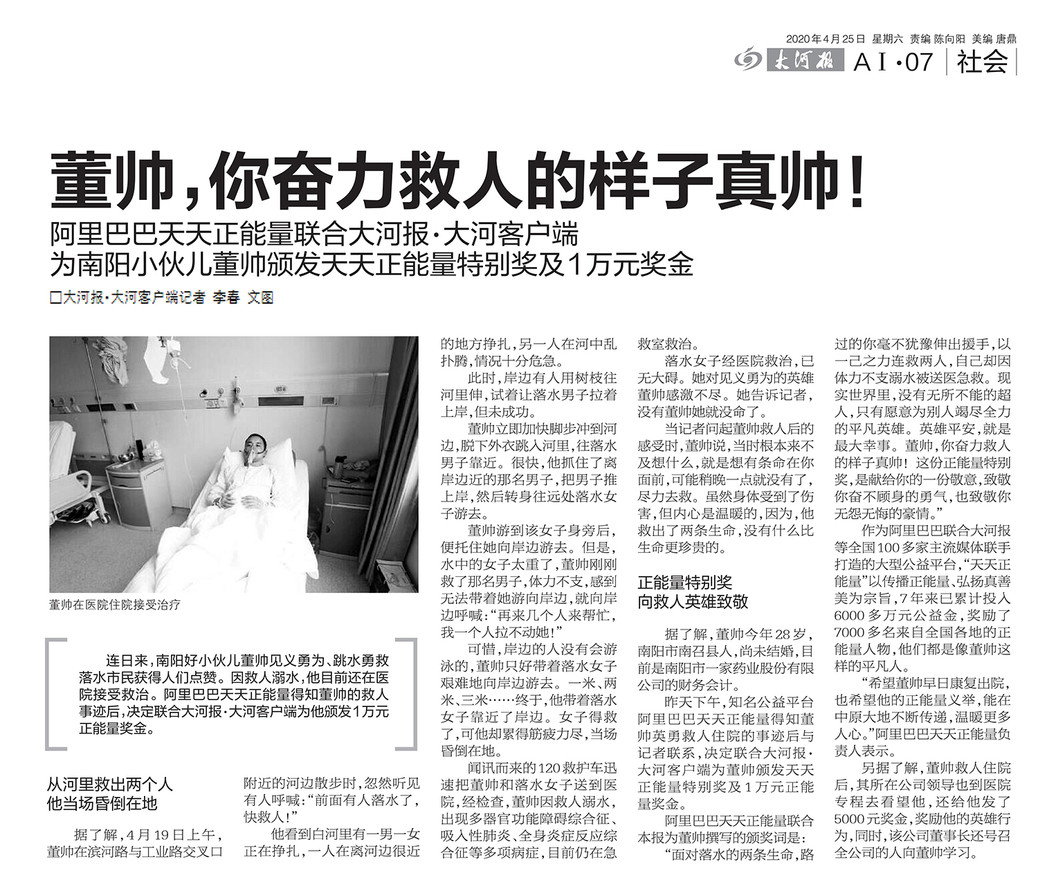 2020年4月19日,濱河路與工業(yè)路交叉口附近的河邊一男一女落水,散步路過(guò)的董帥不顧個(gè)人安危,挺身而出,以一己之力連救兩人,自己卻因體力不支溺水被送醫(yī)急救,因多器官功能障礙綜合征、吸入性肺炎、全身炎癥反應(yīng)綜合征等多項(xiàng)病癥在醫(yī)院治療十余日。2021年12月,董帥被臥龍區(qū)授予“見(jiàn)義勇為”榮譽(yù)稱(chēng)號(hào)。
