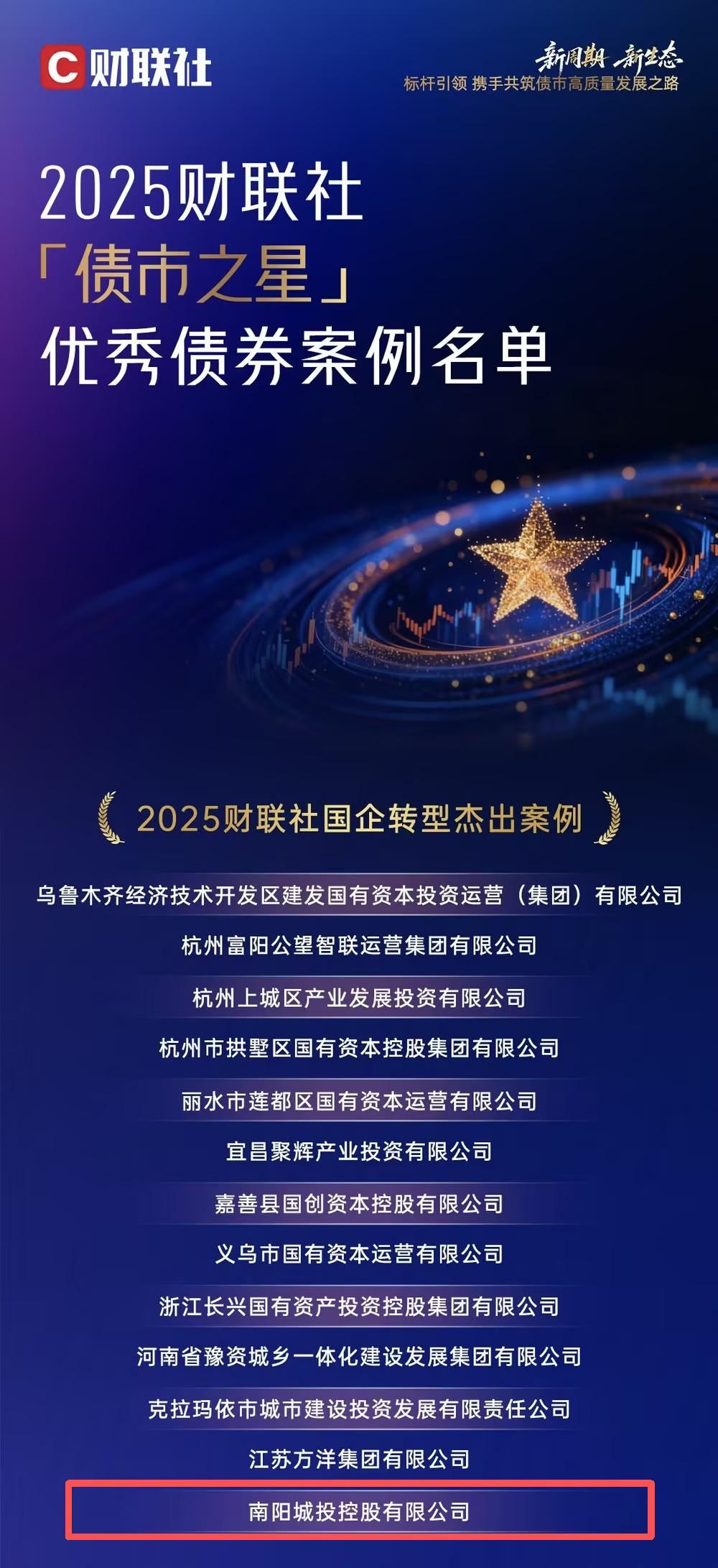 近日,資本市場傳來捷報!在2025財聯(lián)社“債市之星”優(yōu)秀債券案例評選中,南陽投資集團旗下核心子公司—南陽城投控股有限公司(以下簡稱“城投控股公司”)憑借其市場化轉(zhuǎn)型與融資創(chuàng)新實踐,從全國百余家金融機構(gòu)、近200份案例中脫穎而出,榮獲“國企轉(zhuǎn)型杰出案例”獎,成為河南省在此次評選中唯一獲獎的市級主體。