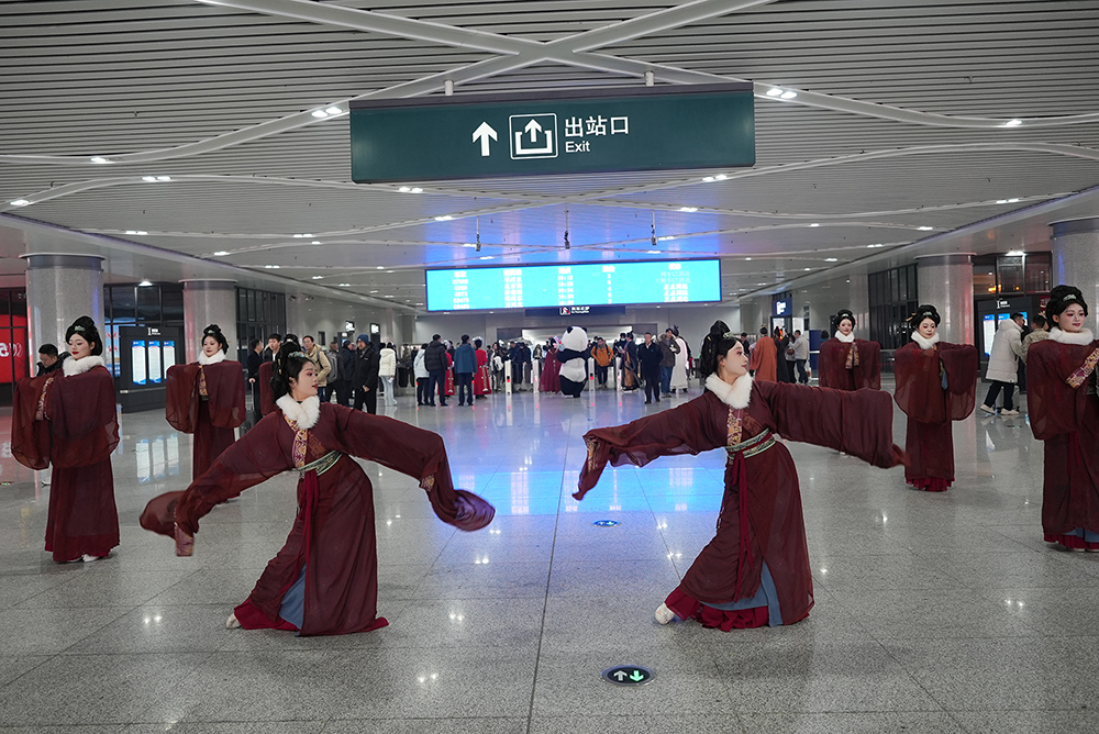 獨(dú)具南陽地域特色的原創(chuàng)舞蹈《大美南陽·一個值得三顧的地方》《福佑南陽》在站內(nèi)特定區(qū)域精彩上演。舞蹈演員們以優(yōu)美的舞姿,藝術(shù)化地展現(xiàn)了南陽的楚風(fēng)漢韻、南都帝鄉(xiāng)的大美南陽文化底蘊(yùn),傳遞出祈福納祥、歡迎八方來賓的美好寓意,吸引了大量旅客駐足觀賞、拍照錄像,將現(xiàn)場氣氛推向高潮。